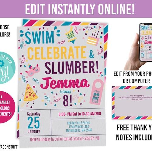 Hotel Swimming Birthday Party Invitation Sleepover Slumber Etsy